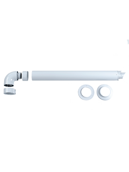 Базовый комплект оригинального дымохода включает в себя два хомута для крепления труб между собой и в выходу котла, коаксиальный поворот 87 градусов (обеспечивающий уклон трубы в сторону земли для стока конденсата), основную коаксиальную трубу 60 мм/100 мм и пластиковый наконечник, предотвращающий попадание птиц и животных в котел.